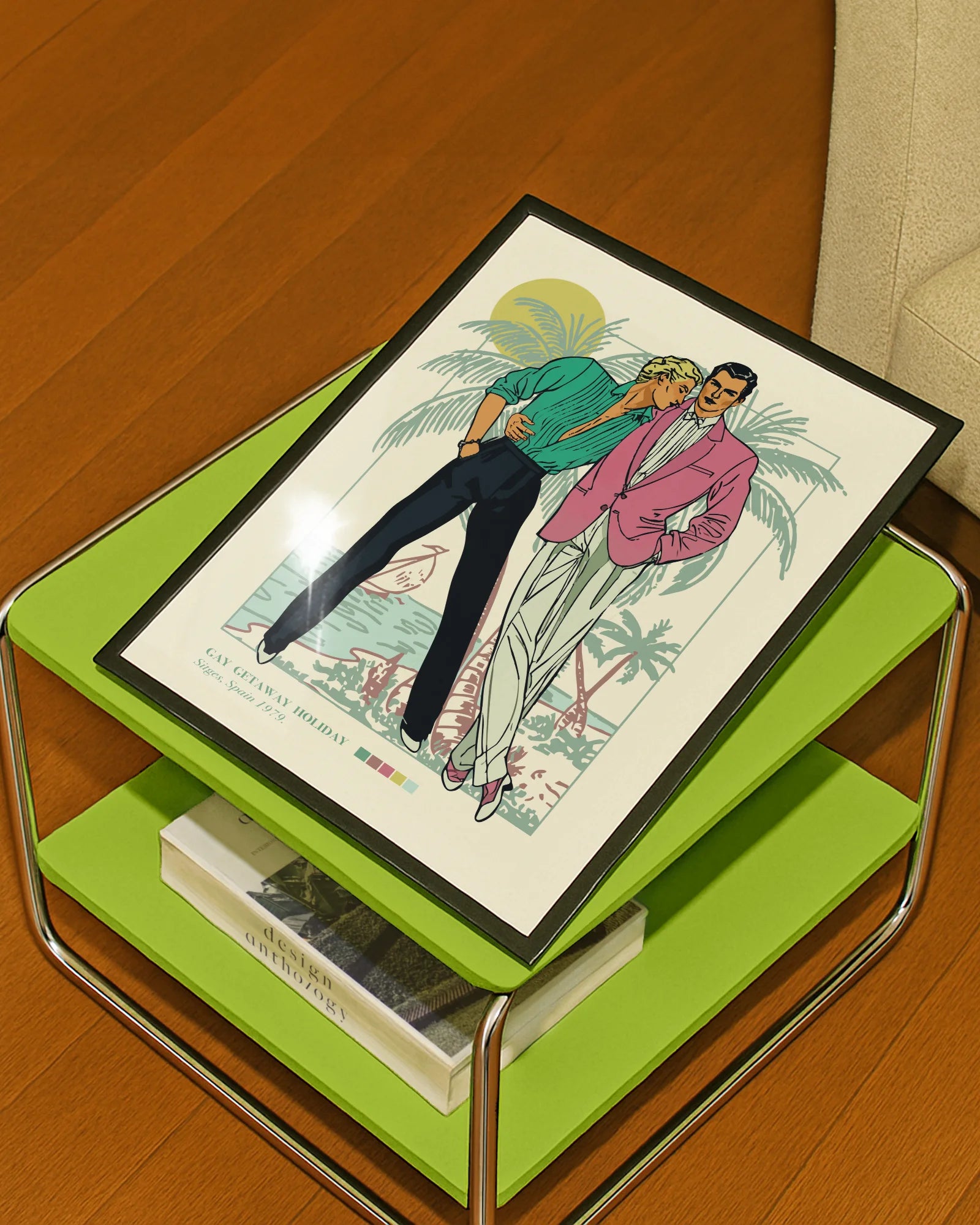 Postern föreställer två homosexuella män i en romantisk kram framför en varm strand, med texten:"GAY GETAWAY HOLIDAY" & "Sitges, Spain 1979".