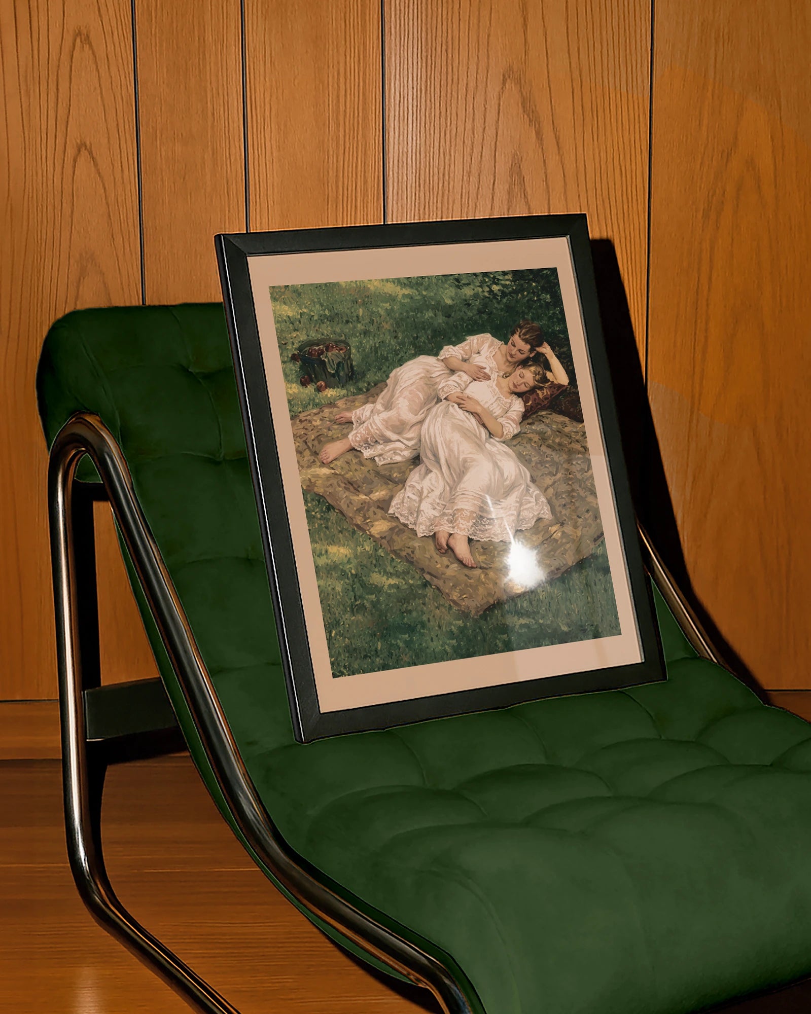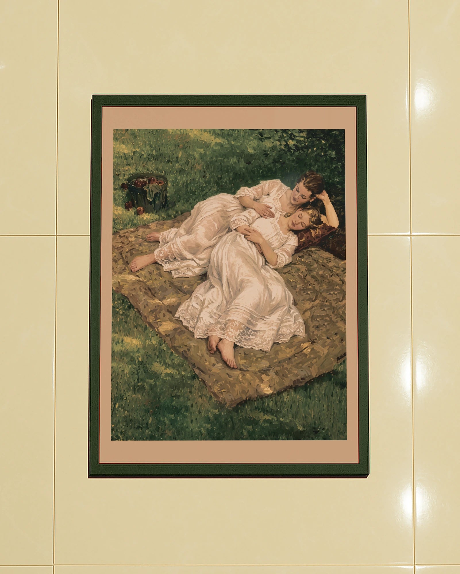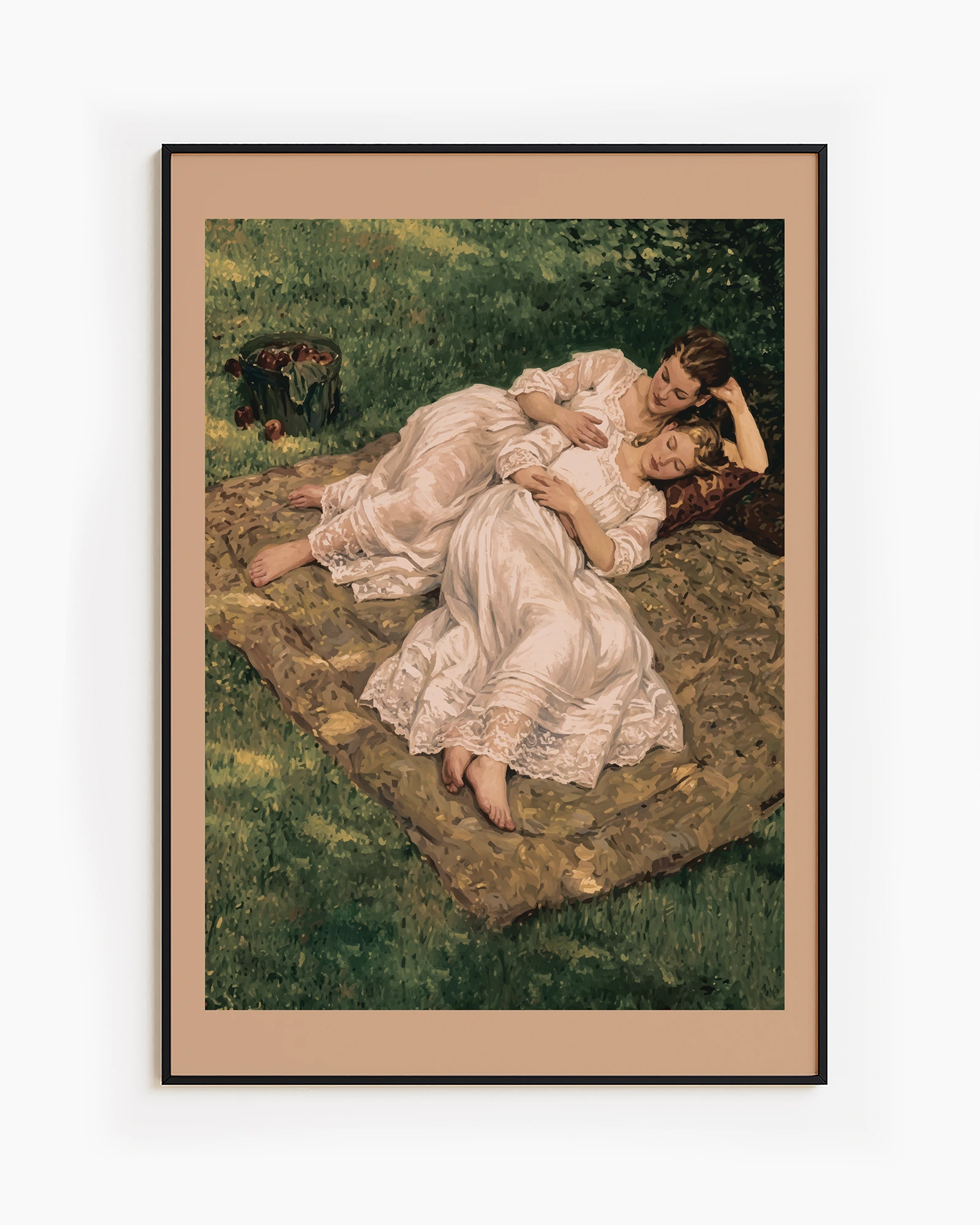 Postern föreställer två vackra kvinnor iklädda vita sommarklänningar, kramandes på en filt i en park.
