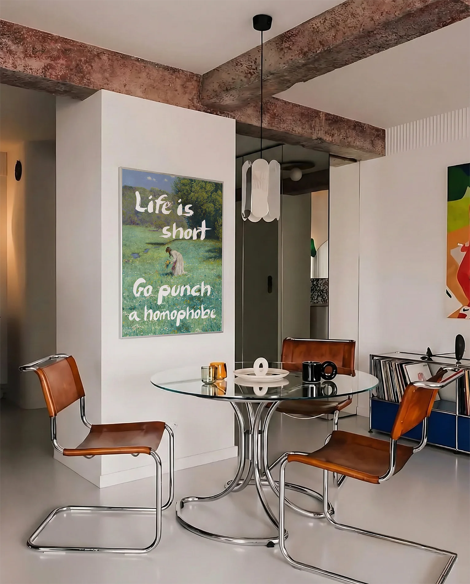Postern föreställer en kvinna som plockar blommor i ett öppet fält, i en klassisk oljemålnings-stil med texten 'Life is short Go punch a homophobe".